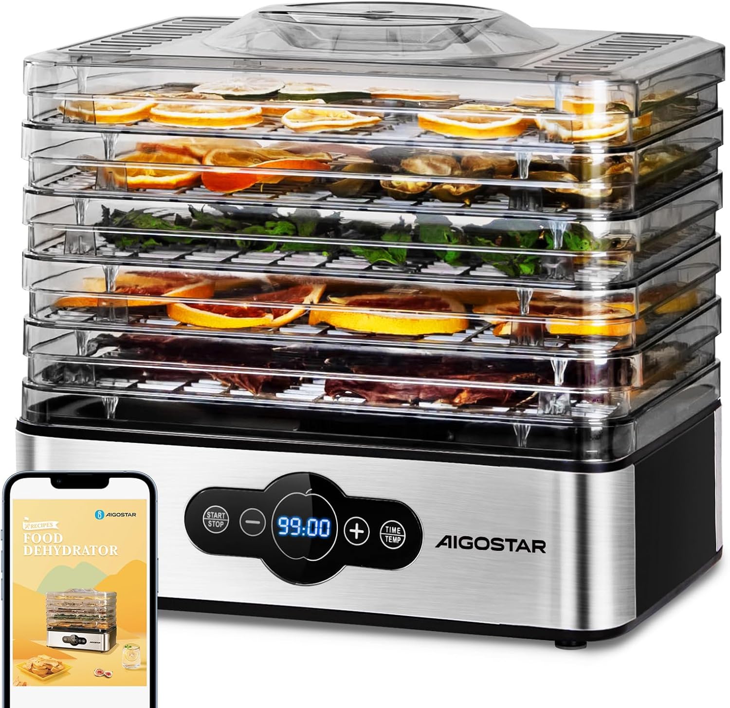 Leistung & Temperaturbereich: Präzise Temperaturregelung von 35-70°C.Trocknungsfläche & Etagen: Fünf höhenverstellbare Schalen für Lebensmittel.