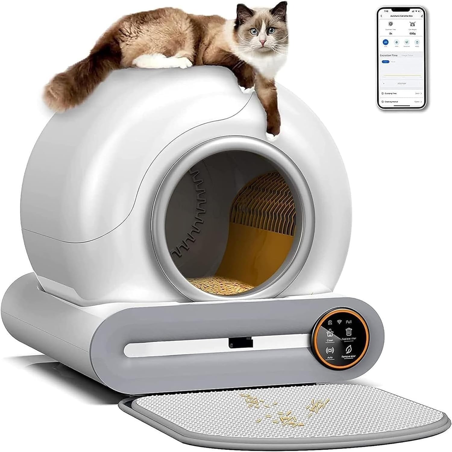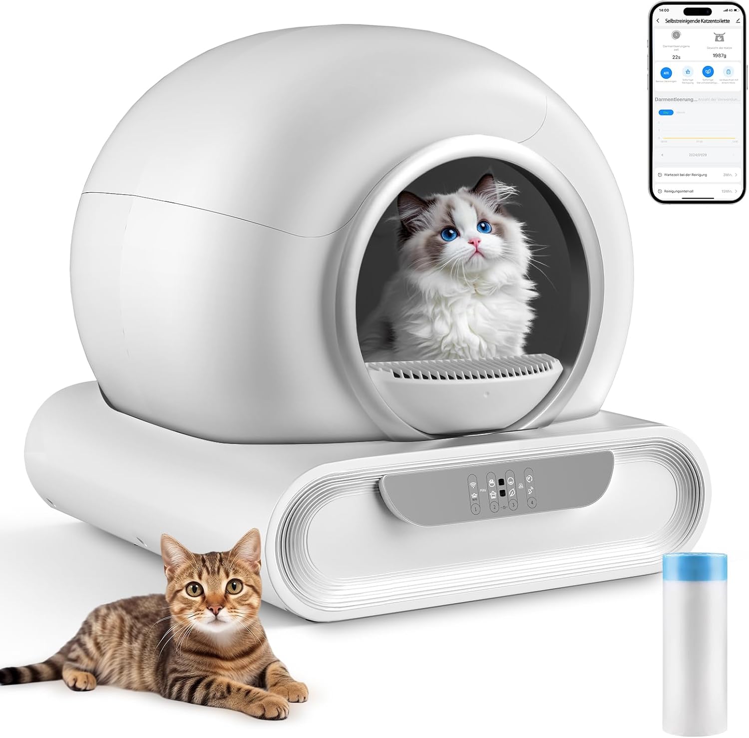 Technik & Konnektivität: Überwacht das Gewicht, die Toilettenzeit und -häufigkeit per App und erstellt individuelle Gesundheitsprofile für jede Katze.