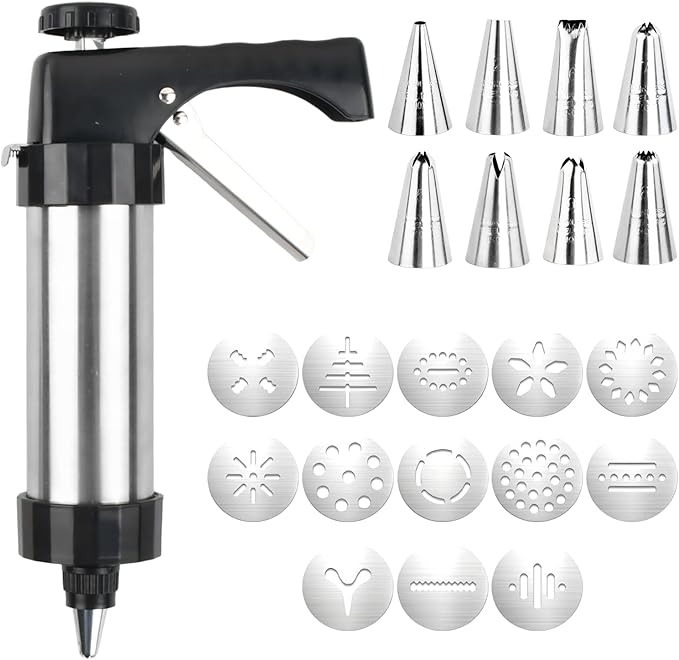 Aufsätze & Formen: Enthält 13 austauschbare Aluminiumschablonen für verschiedene Gebäckformen und 8 vielseitige Spritztüllen aus rostfreiem Edelstahl.